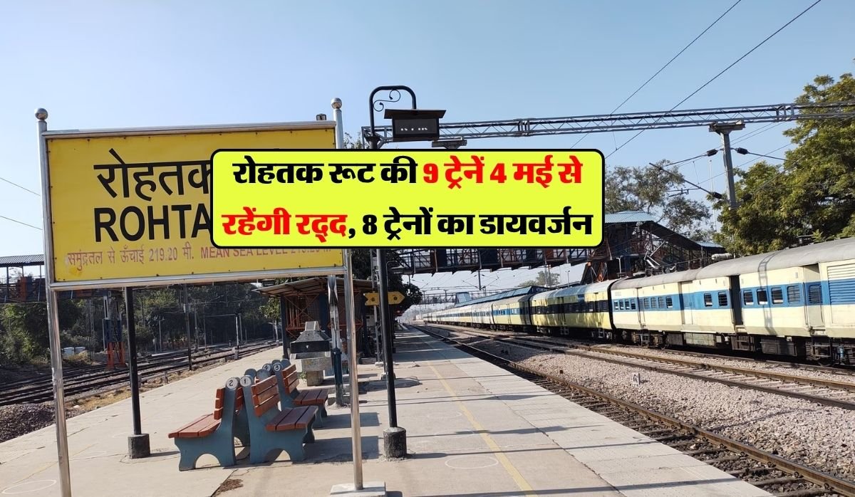 मीना ने बताया कि नई दिल्ली से चलकर दोपहर 12:20 बजे रोहतक पहुंचने वाली ट्रेन, रोहतक से दोपहर 2 बजे नई दिल्ली जाने वाली ट्रेन, दिल्ली जंक्शन से चलकर रोहतक होते हुए दोपहर 01:44 बजे जींद जाने वाली, जींद से चलकर रोहतक हुए सुबह 08:12 बजे दिल्ली जाने वाली ट्रेनें 5 मई से 14 मई के बीच में रद्द रहेंगी।