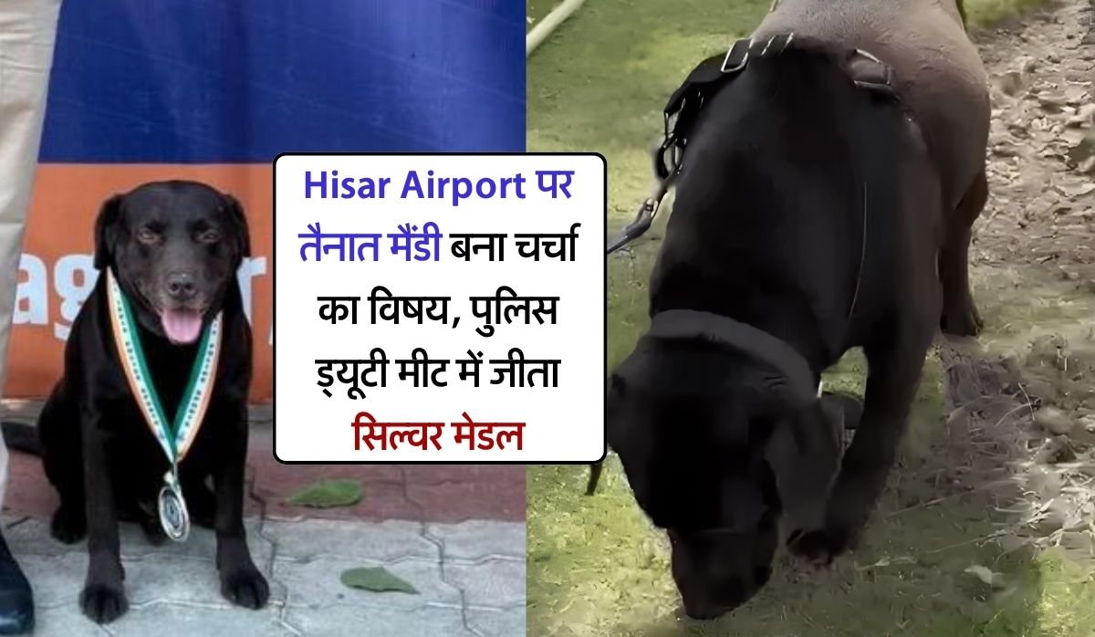 Hisar Airport : इन दिनों हरियाणा पुलिस का एक लेब्रा ब्रीड का डॉग काफी ज्यादा फेमस हो रखा है। हिसार एयरपोर्ट पर तैनात डॉग मैंडी ने अपना दम दिखाते हुए पुलिस ड्यूटी मीट में सिल्वर मेडल जीता है। आइए जानते हैं चर्चा का विषय बने इस मैंडी डॉग के बारे में विस्तार से।